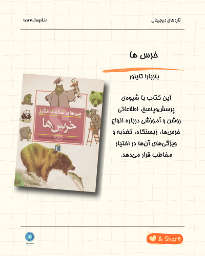 خرس ها مؤلف: باربارا تايلور (این کتاب با شیوهی پرسشوپاسخ، اطلاعاتی روشن و آموزشی درباره انواع خرسها، زیستگاه، تغذیه و ویژگیهای آنها در اختیار مخاطب قرار میدهد.)