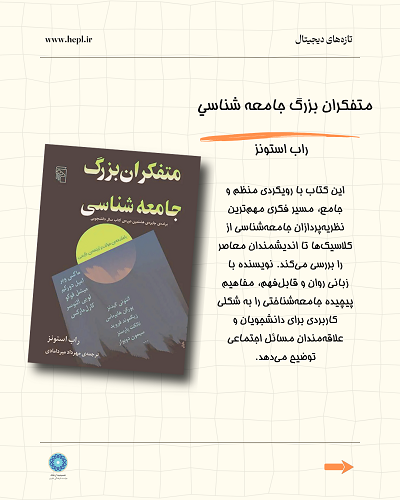 متفكران بزرگ جامعه شناسي مؤلف: راب استونز (این کتاب با رویکردی منظم و جامع، مسیر فکری مهمترین نظریهپردازان جامعهشناسی از کلاسیکها تا اندیشمندان معاصر را بررسی میکند. نویسنده با زبانی روان و قابلفهم، مفاهیم پیچیده جامعهشناختی را به شکلی کاربردی برای دانشجویان و علاقهمندان مسائل اجتماعی توضیح میدهد.)