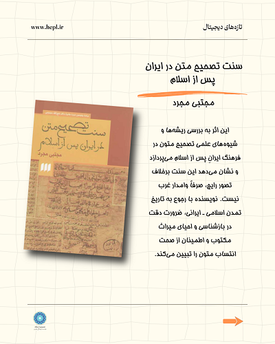 سنت تصحیح متن در ایران پس از اسلام مؤلف: مجتبی مجرد (این اثر به بررسی ریشهها و شیوههای علمی تصحیح متون در فرهنگ ایرانِ پس از اسلام میپردازد و نشان میدهد این سنت برخلاف تصور رایج، صرفاً وامدار غرب نیست. نویسنده با رجوع به تاریخ تمدن اسلامی ـ ایرانی، ضرورت دقت در بازشناسی و احیای میراث مکتوب و اطمینان از صحت انتساب متون را تبیین میکند.) دانشمندان آذربایجان مؤلف: محمد علی تربیت (این اثر با اتکا به منابع معتبر تاریخی و رجال، شرح احوال ۹۳۴ تن از شخصیتهای برجسته آذربایجان را همراه با فهرست اصلاحشده و اطلاعاتی درباره روزنامههای منتشرشده این منطقه گردآوری کرده است.)